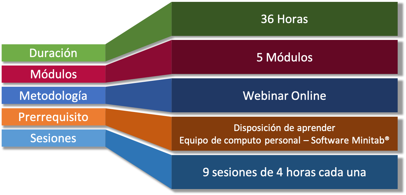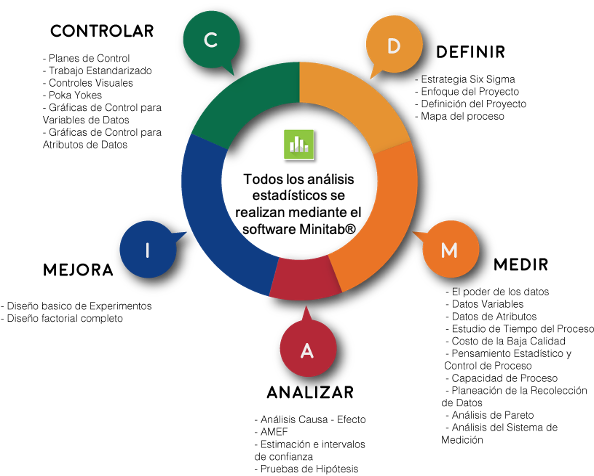 Nos dirigimos mediante la metodología del DMAIC, la cual significa Definir, Medir, Analizar, Implementar y Controlar. Adicionalmente en el entrenamiento aprenderás a utilizar Minitab® para realizar todos los análisis propios de la metodología