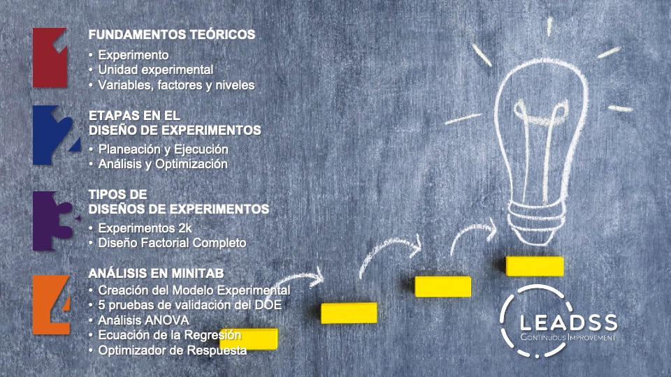 El curso está diseñado para aprender los conceptos teóricos que permitan entender el Diseño de Experimentos e inmediatamente ponerlo a prueba mediante el desarrollo de un Diseño Factorial Completo que permita vivir la experiencia de ejecución y análisis estadístico del Diseño de Experimentos