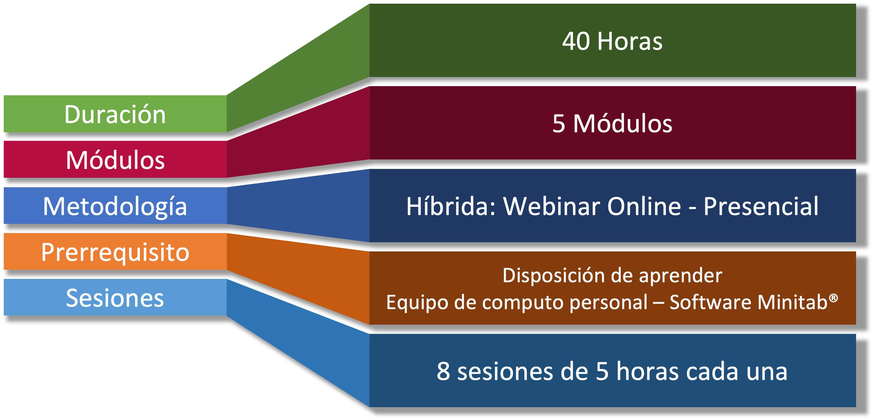 Nos dirigimos mediante la metodología del DMAIC, la cual significa Definir, Medir, Analizar, Implementar y Controlar. Adicionalmente en el entrenamiento aprenderás a utilizar Minitab® para realizar todos los análisis propios de la metodología